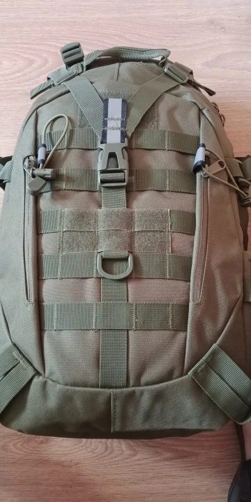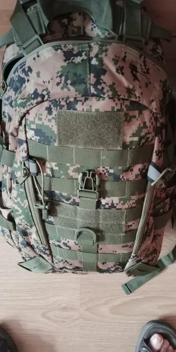 Structure: Main zipper compartment, front zip pocket, side mesh pockets, MOLLE webbing